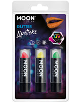Light up the night with our Moon Glitter Neon UV Glitter Lipstick—where glamour meets glow. This show-stopping formula delivers a sexy shimmer that catches every eye, available in three stunning shades: bold red, vibrant yellow, and electric green. Each colour features dazzling glitter particles that sparkle under UV light, perfect for parties, festivals, and nights you want to remember. Make a statement with lips that literally shine.