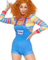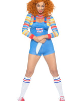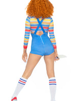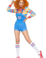 This frightful Demon Doll Romper Costume is sure to spook all, while still looking ravishingly attractive and alluring. The 2 Piece set includes a striped crop top and stylish denim-look romper overalls. Flaunt your bombshell curves in the brightly colored striped crop top with playful peek-a-boo detailing and flattering bodycon fit. The back-zippered romper overall perfectly accentuates the figure of any tiny terror.