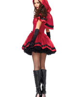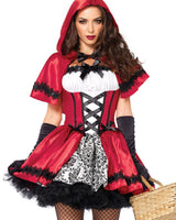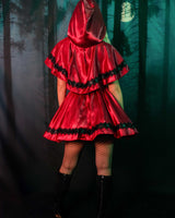 Unleash your rebellious side with this Gothic Red Riding Hood costume. The set includes a snug peasant dress made of satin and brocade, with intricate Venetian lace and woven ribbon accents. To complete the look, a hooded cape is also included, but beware - the basket, gloves, and petticoat are not part of the deal.