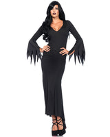 Unleash your dark side with this floor length black gothic dress. Perfect for Halloween or any occasion that calls for a touch of fright. Embrace the darkness in style.