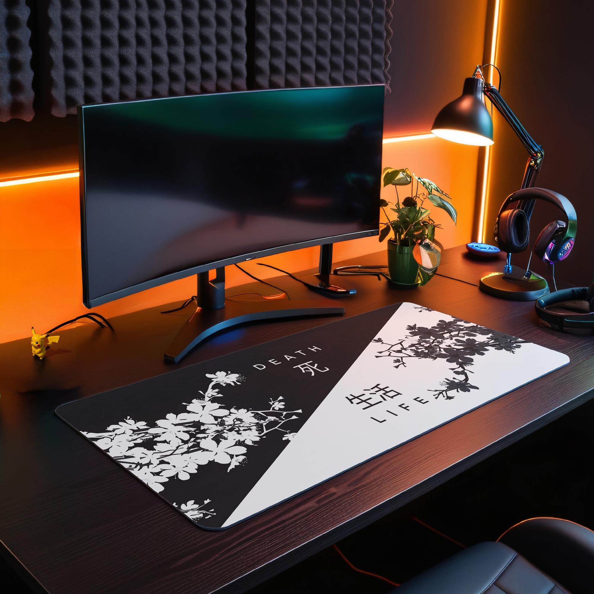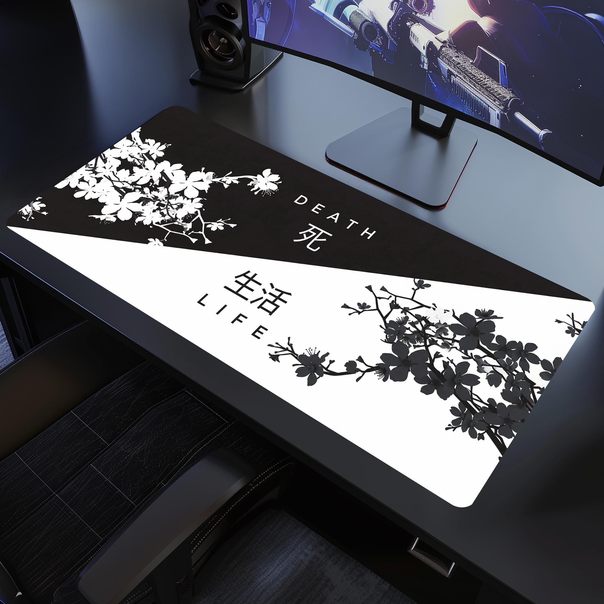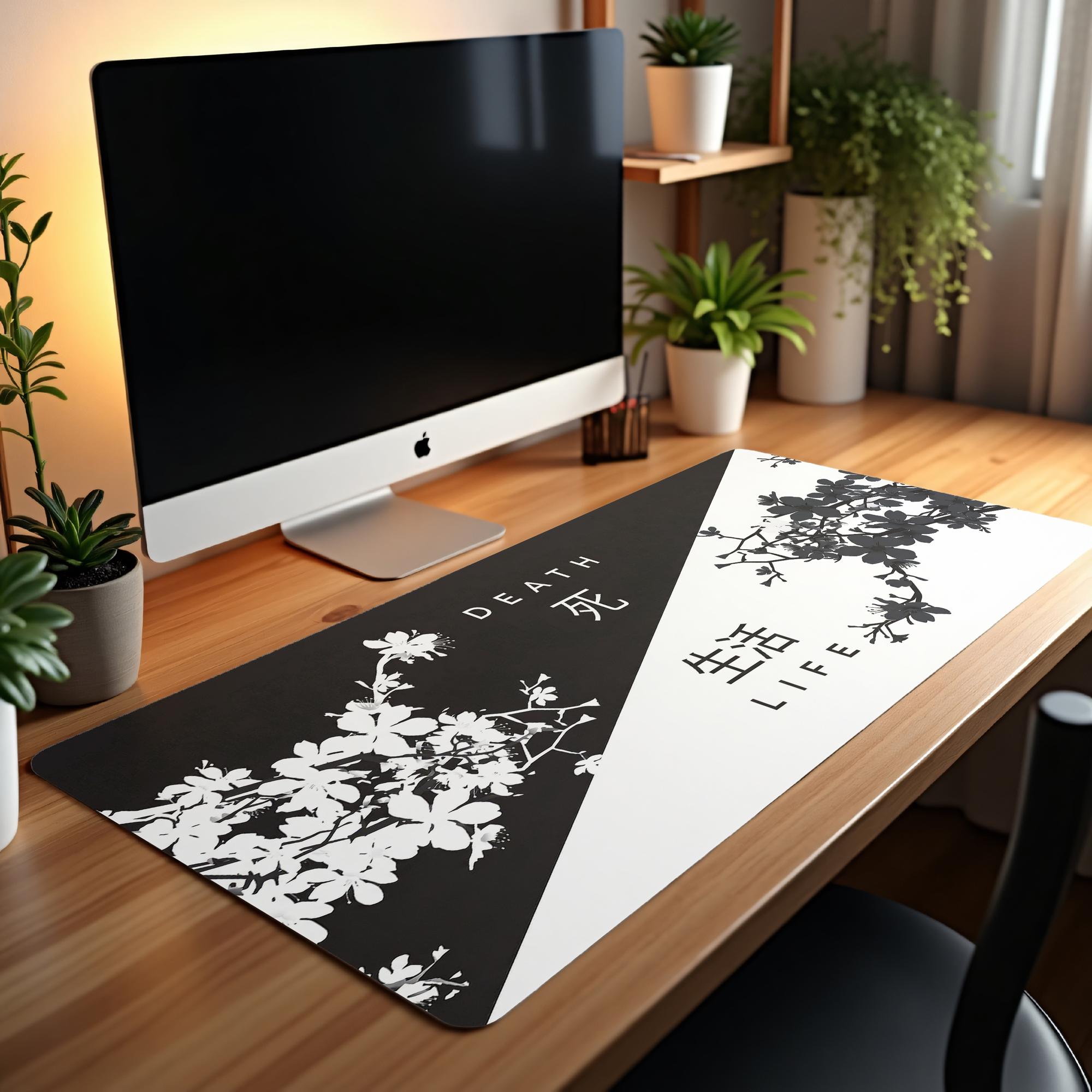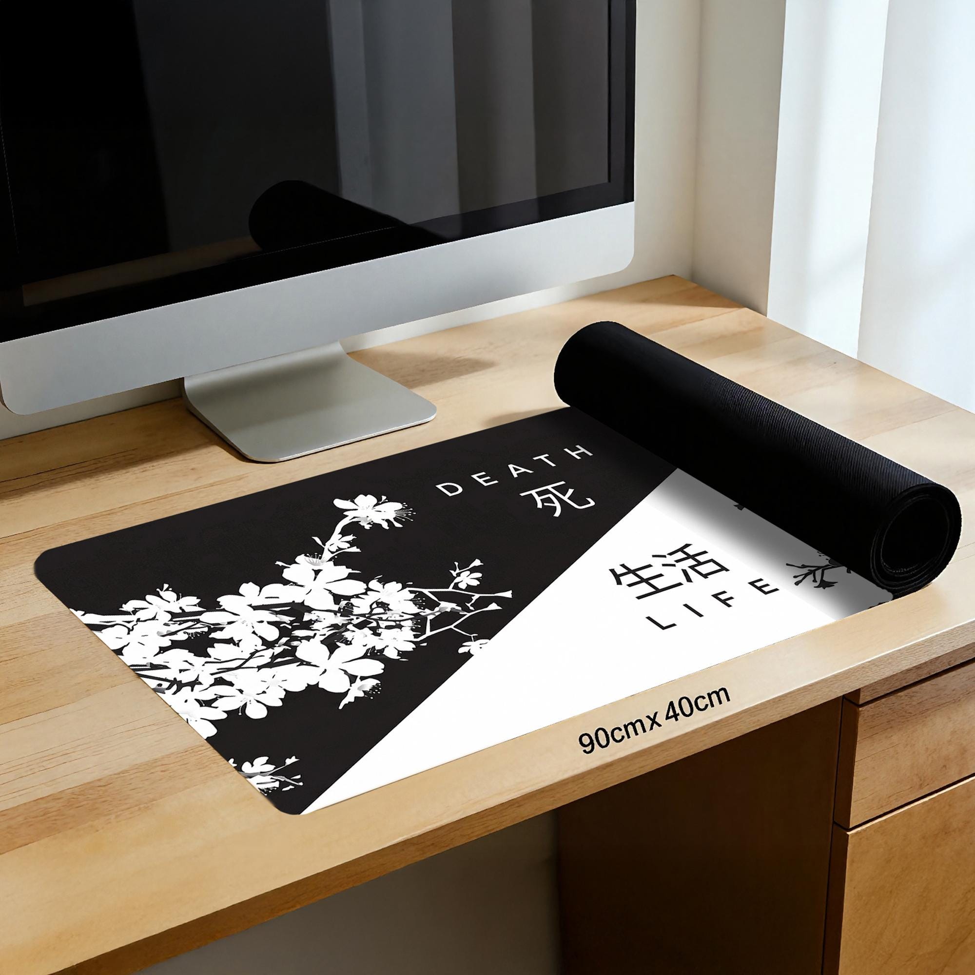 Death and Life Deskpad 90cm x 40cm, Black and White Floral Design, Office Desk Mat, Artistic Computer Mat