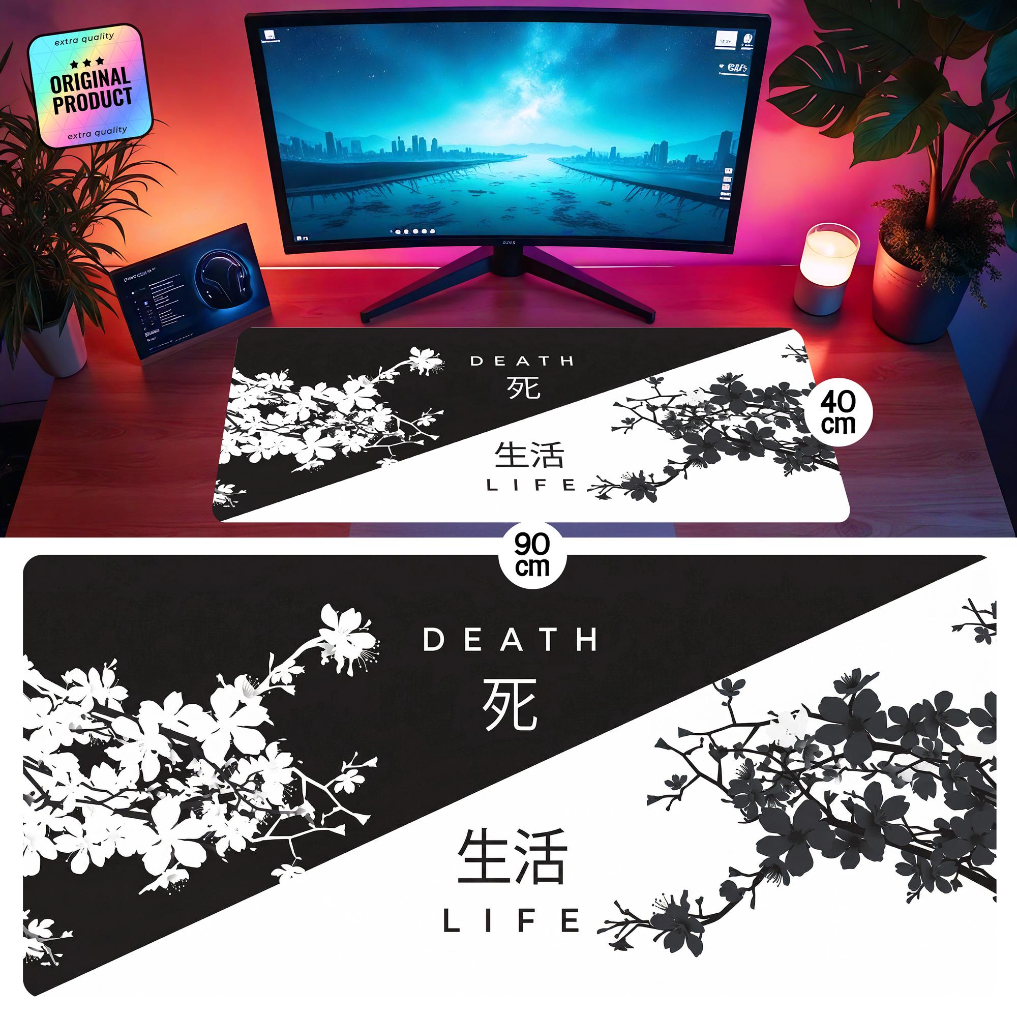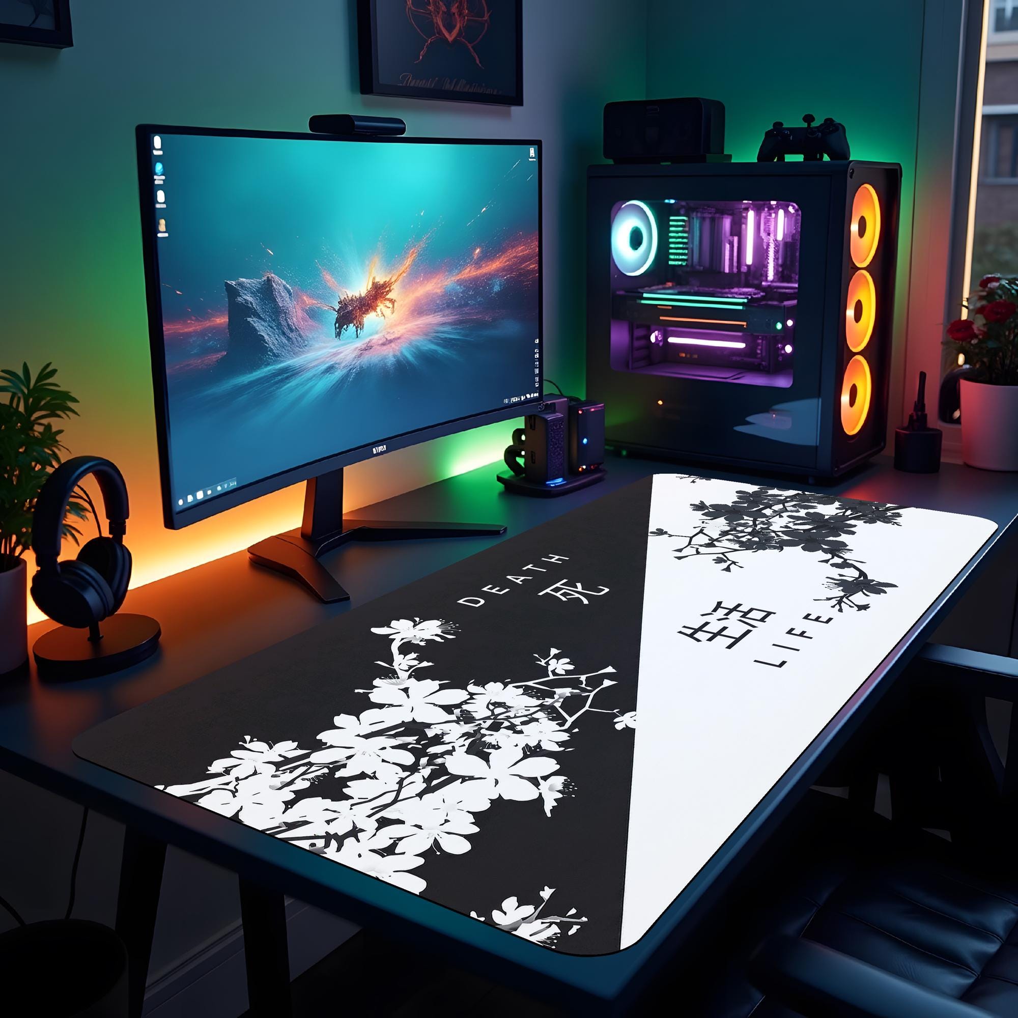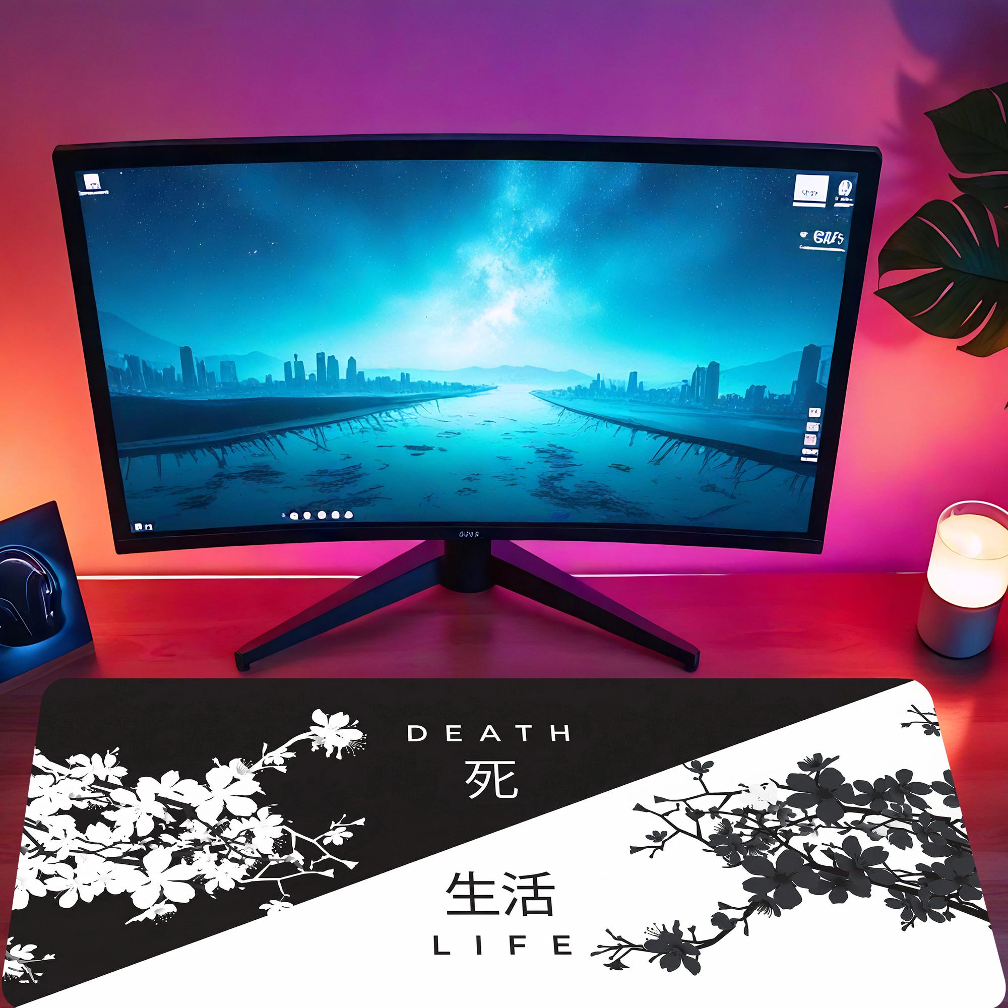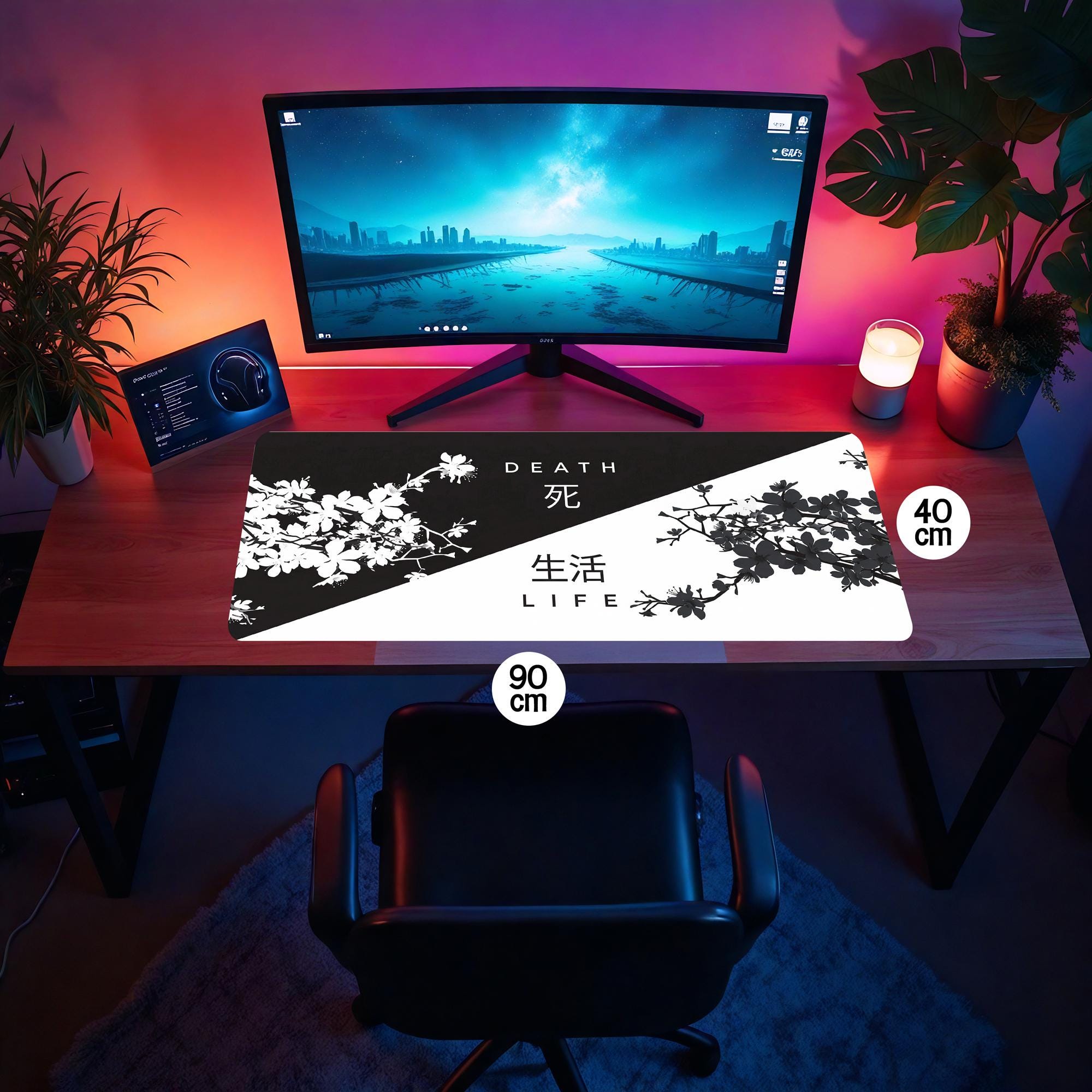 Death and Life Deskpad 90cm x 40cm, Black and White Floral Design, Office Desk Mat, Artistic Computer Mat