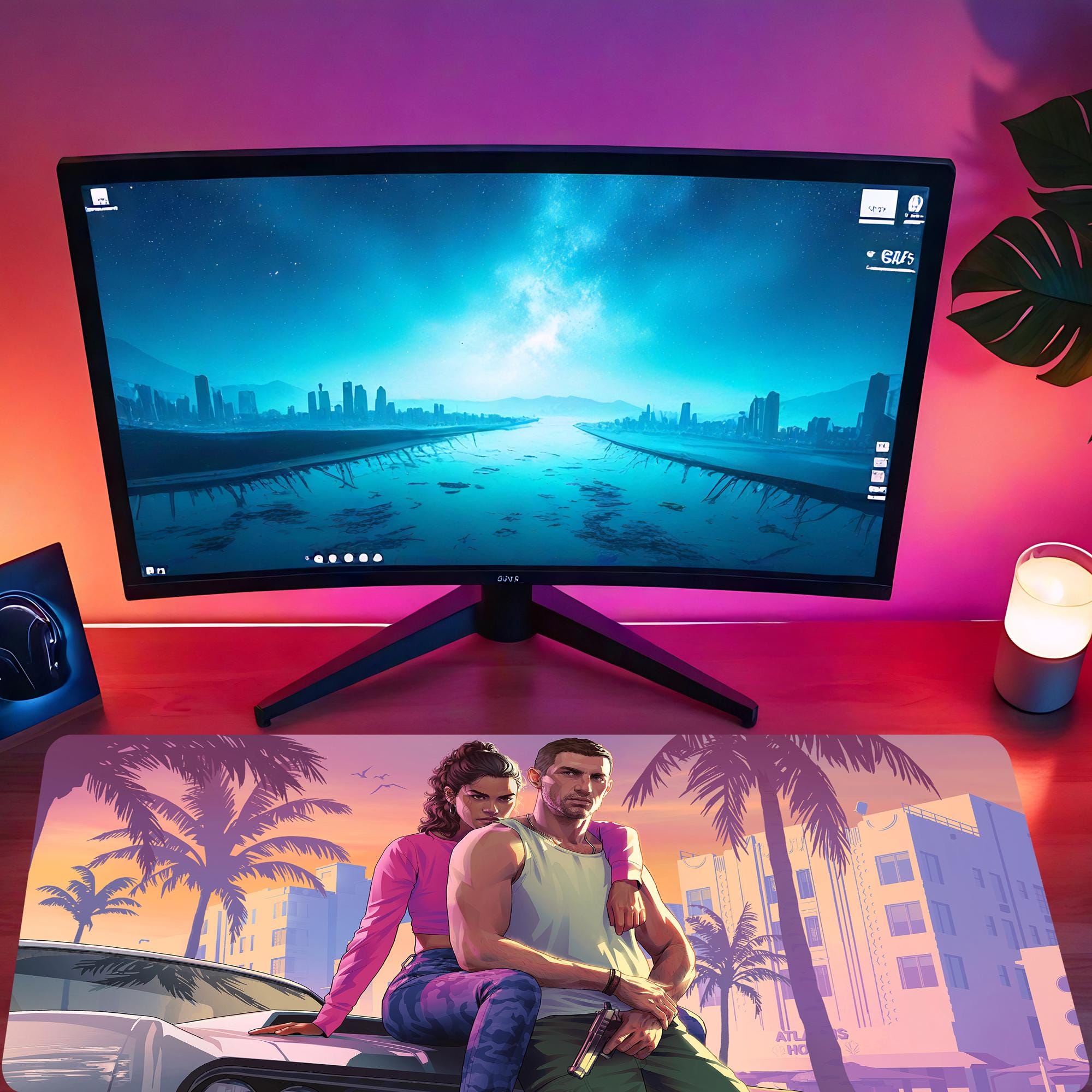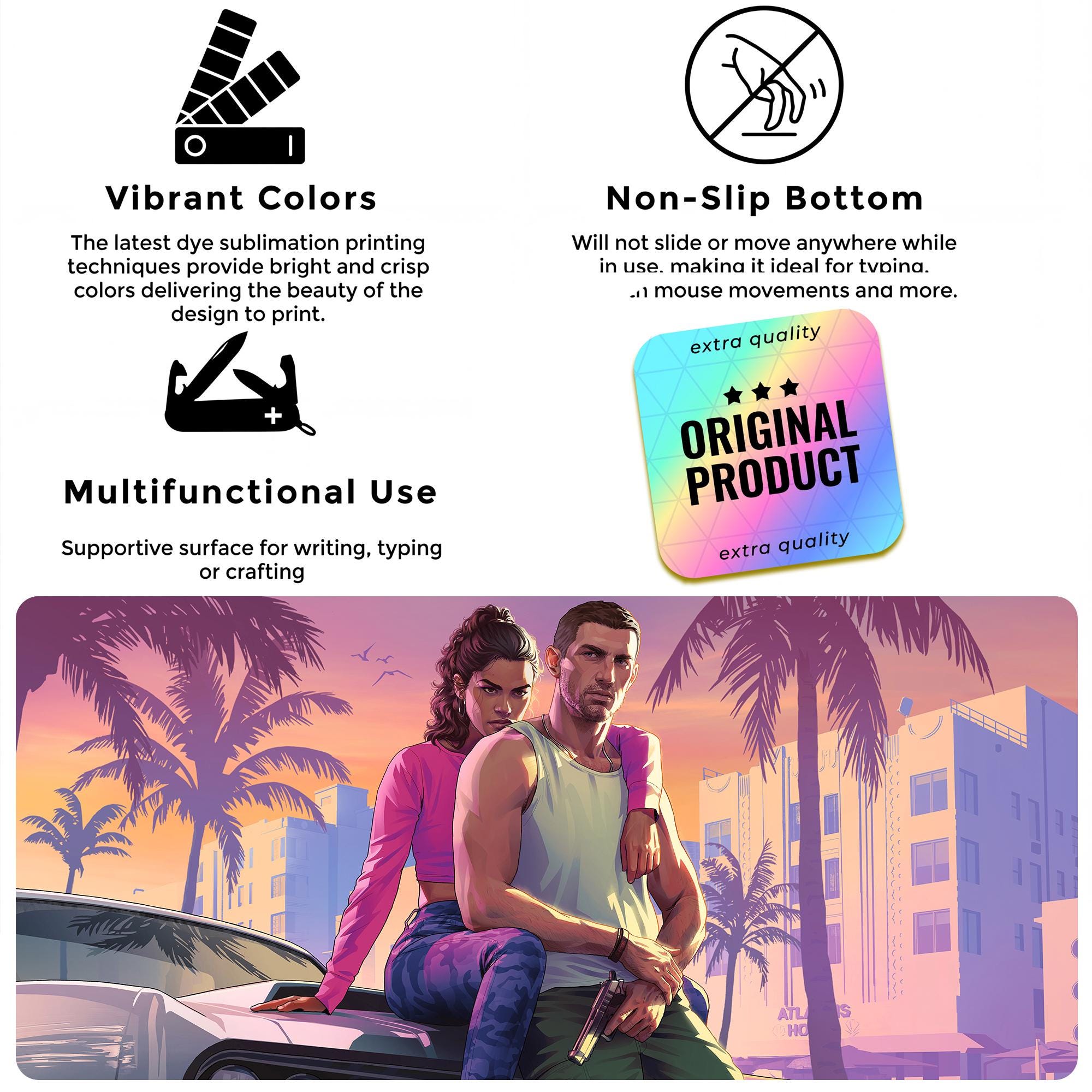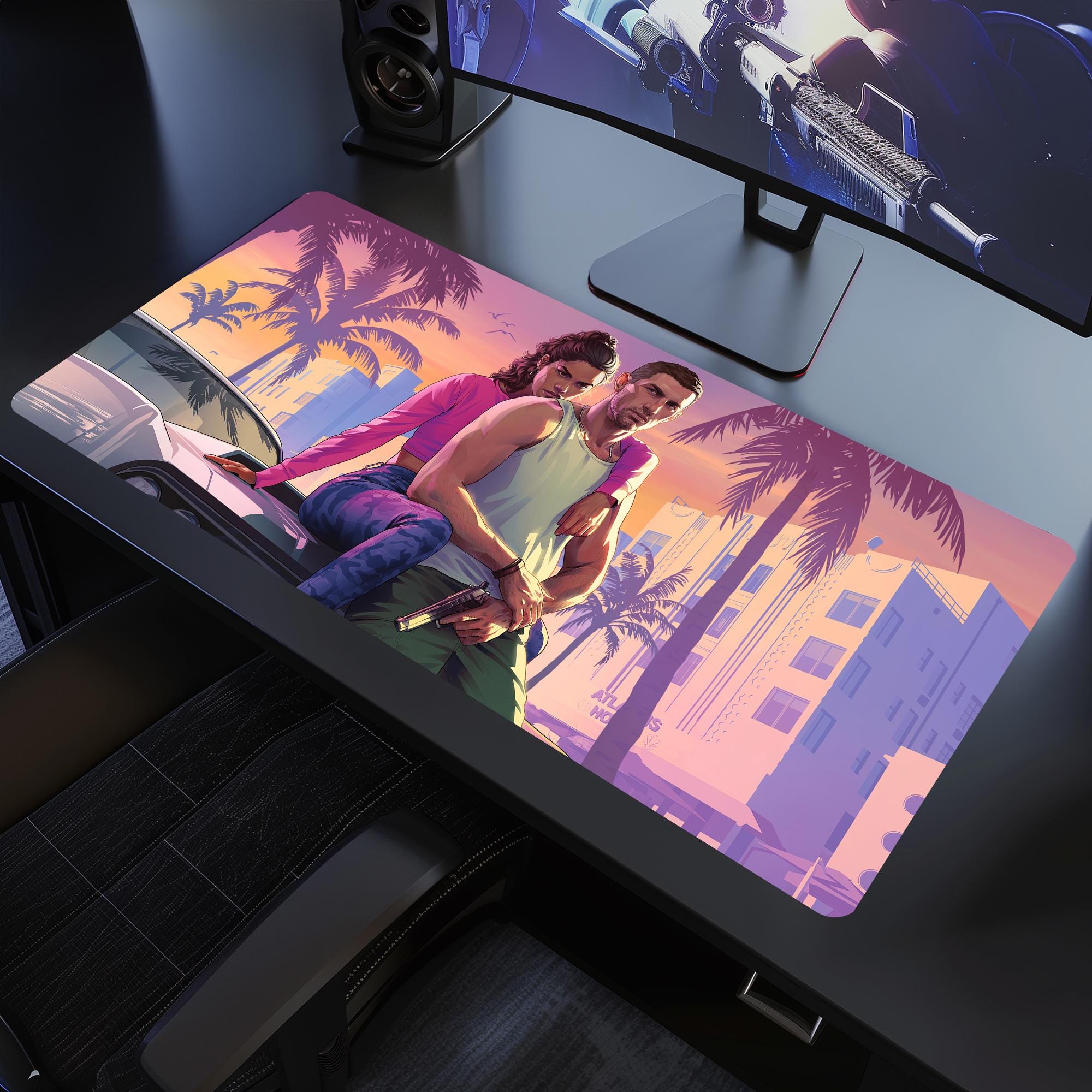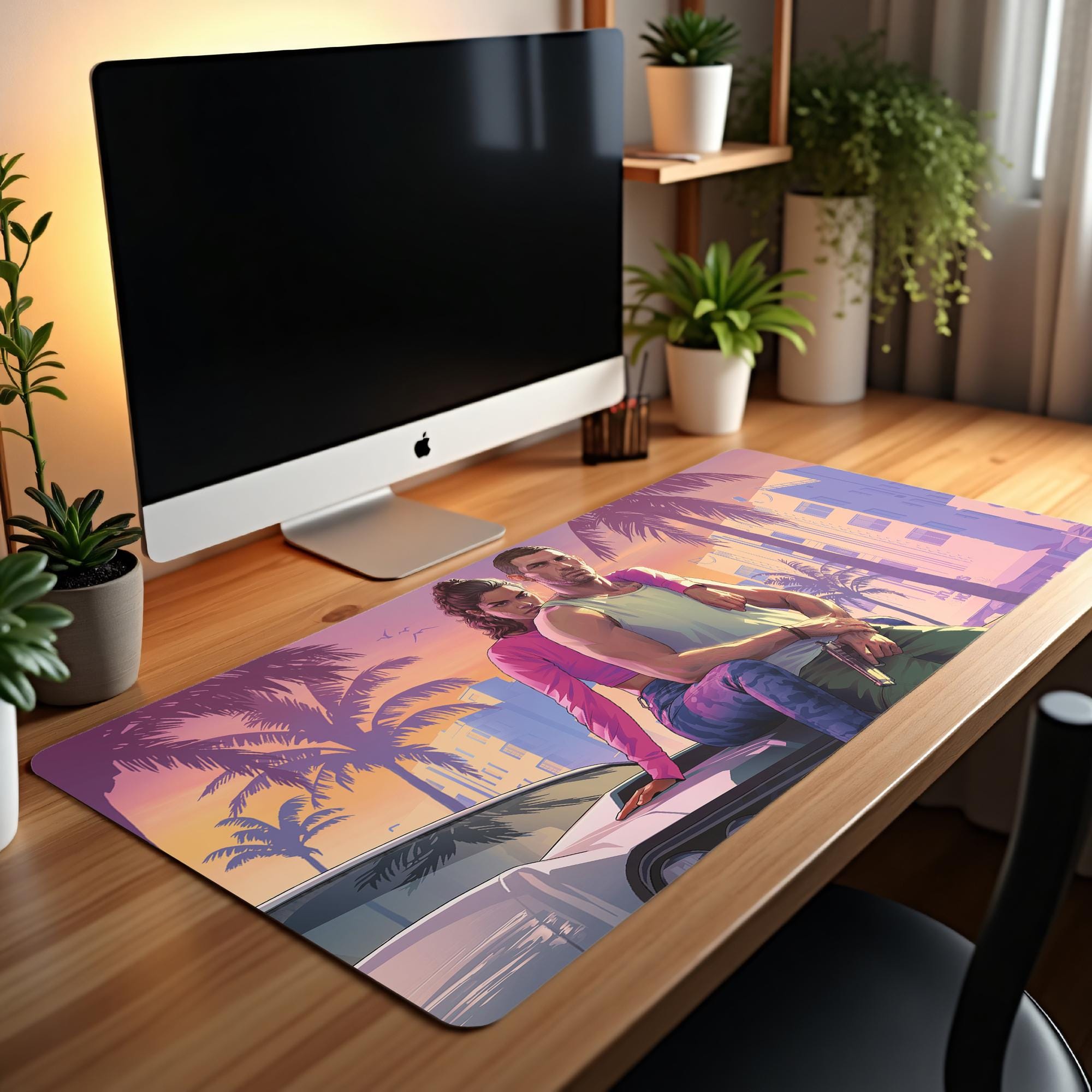 Elevate your gaming and workspace with the Leonida Crime Deskpad, a stunning 90cm x 40cm large mouse pad featuring a captivating tropical sunset design. This eye-catching desk mat adds a vibrant, artistic touch to any office or gaming setup, inspiring creativity and relaxation during your most intense sessions.