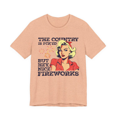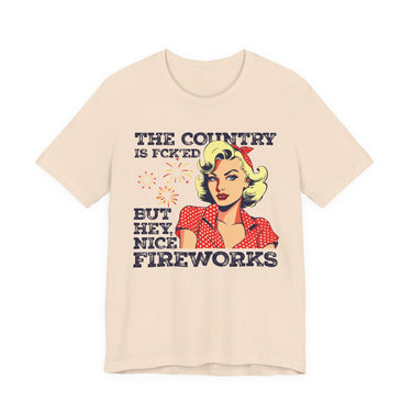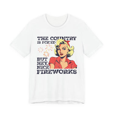 Retro Pop Art Tee "The Country Is F*cked But Hey, Nice Fireworks" - Political Humor 4th of July Shirt