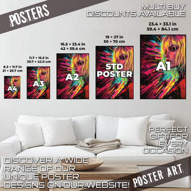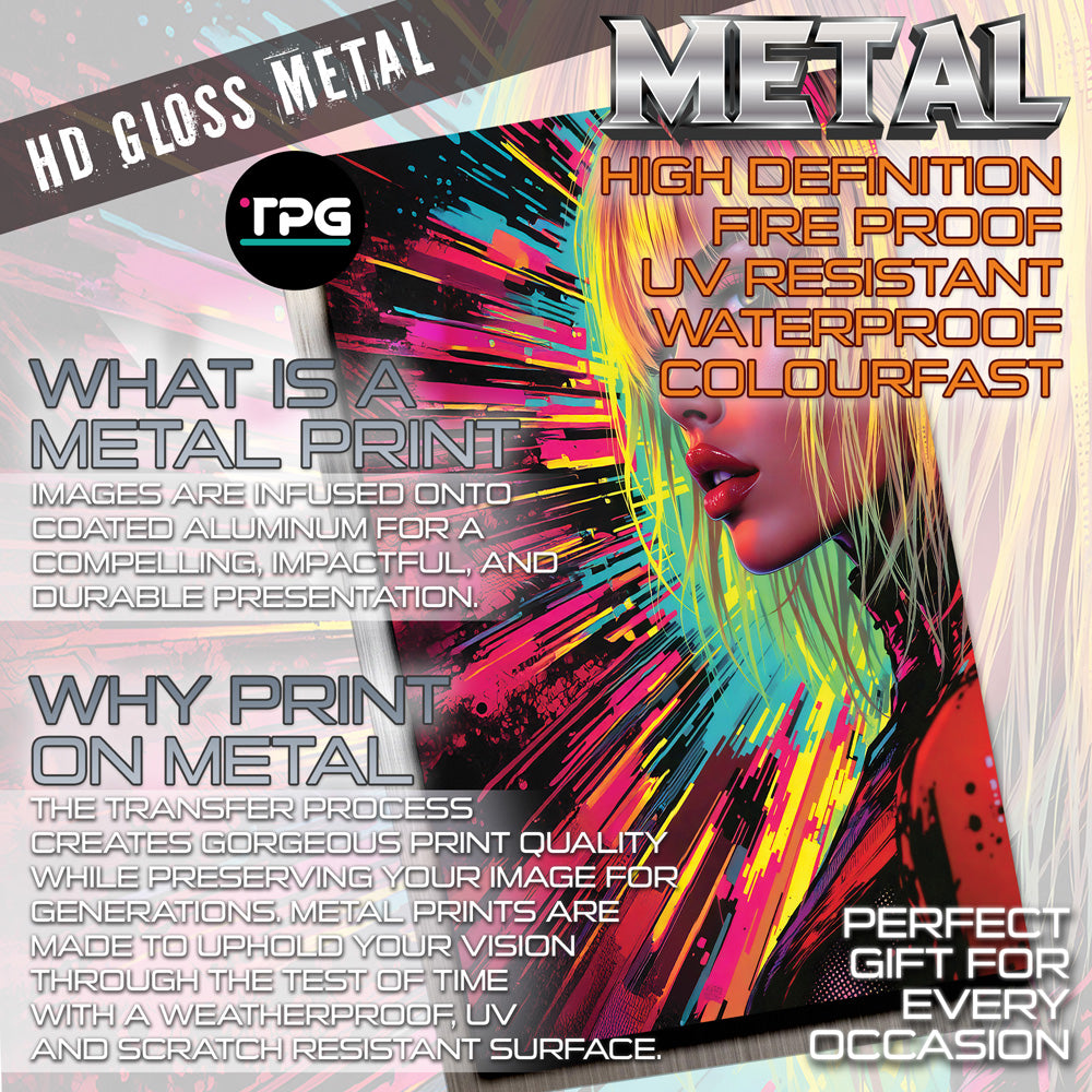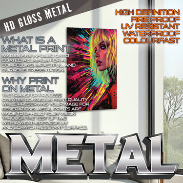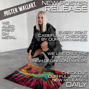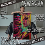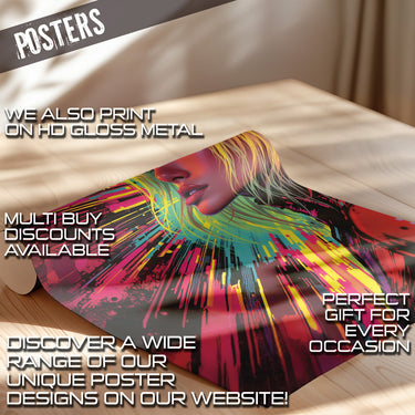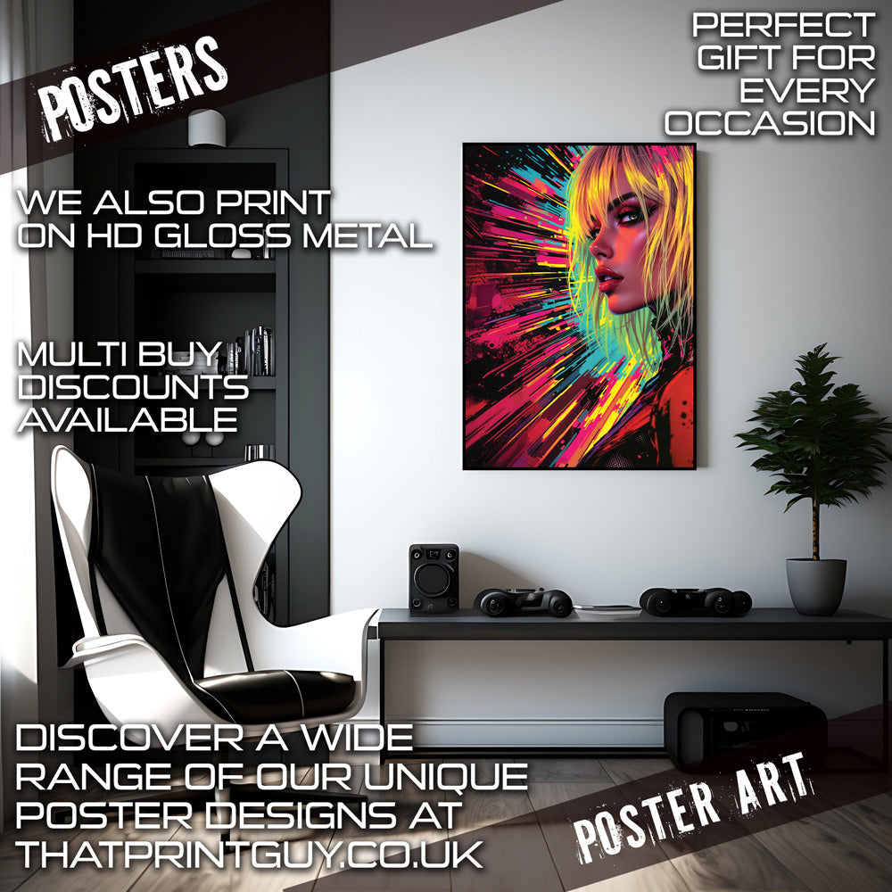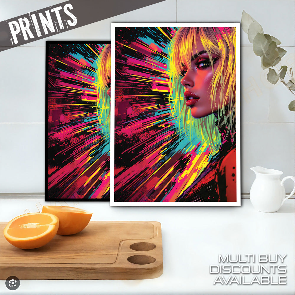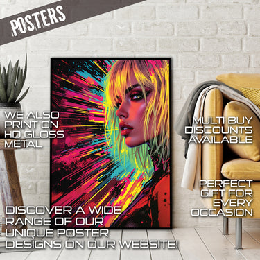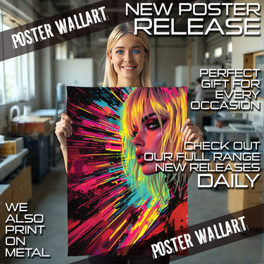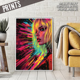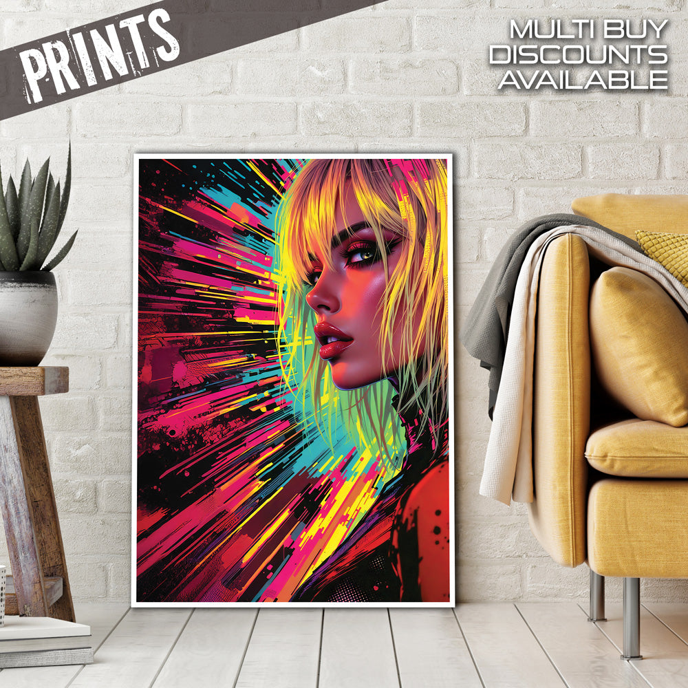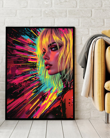 Unleash a burst of vibrant energy with our "ColorStorm" Poster Print! This electrifying artwork features a captivating woman with striking blonde hair and intense eyes, gazing confidently from the side. Her face is rendered with a mix of realistic detail and artistic flair, framed by a dynamic explosion of neon pink, electric blue, sunny yellow, and fiery orange streaks that emanate from behind her. This piece perfectly blends portraiture with abstract dynamism, creating an unforgettable visual experience.