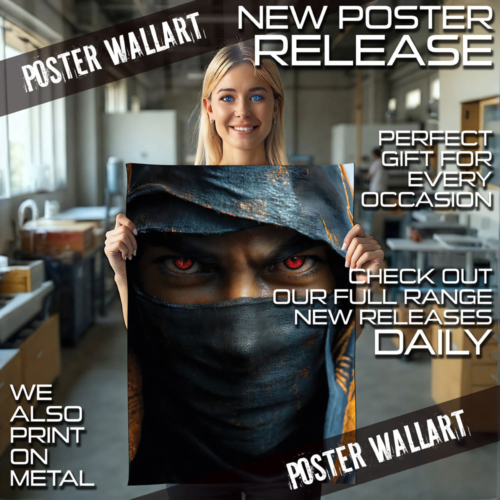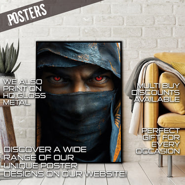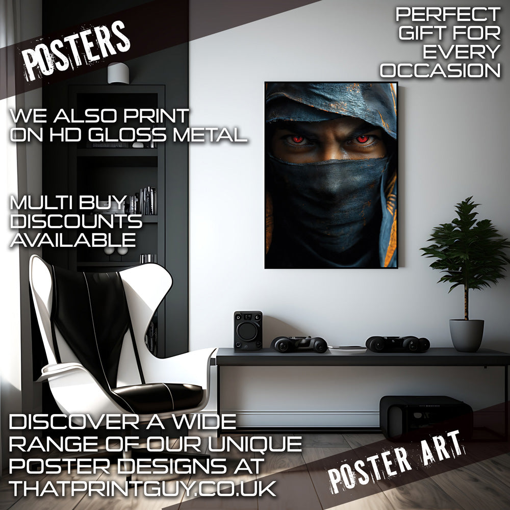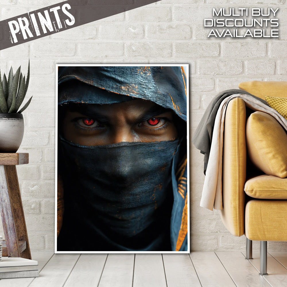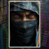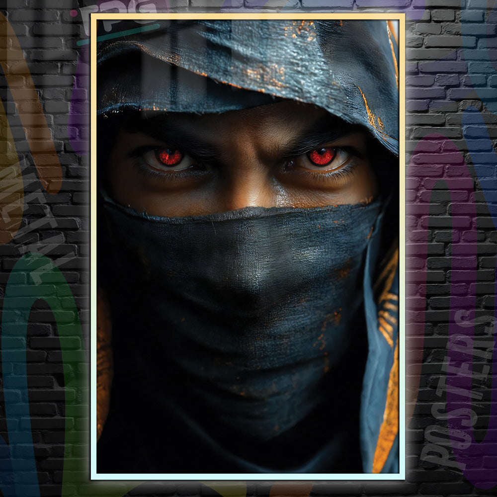Crimson Veil captures the intense gaze of a mysterious figure, his red eyes piercing through the shadows wrapped in a black cloak. This striking image evokes the stealth and precision of an assassin, perfect for those drawn to bold, enigmatic style. Embrace the power and intrigue of Crimson Veil.