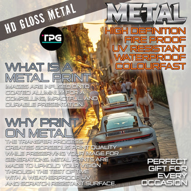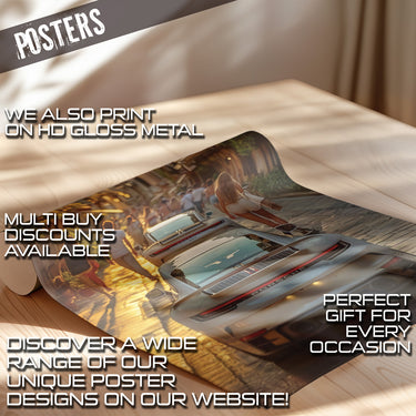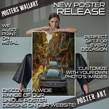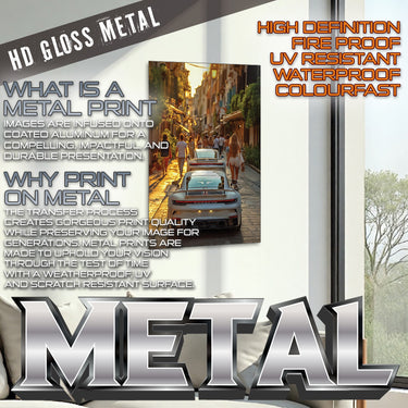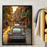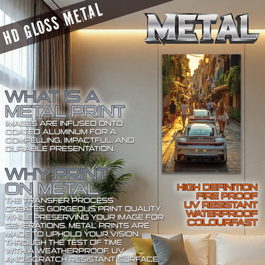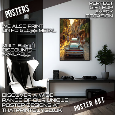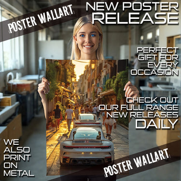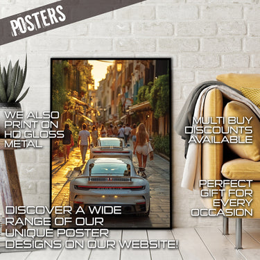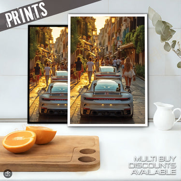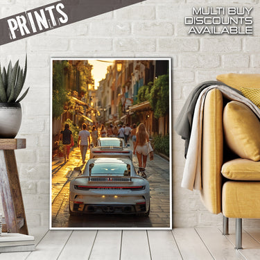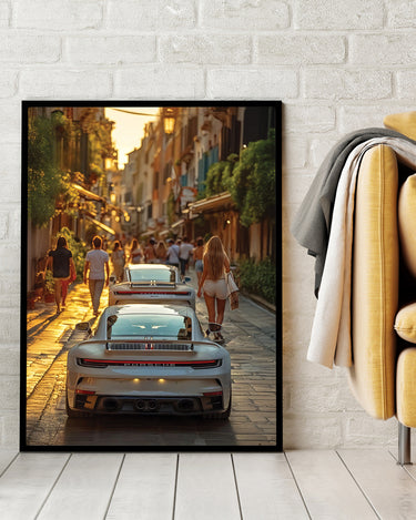 Experience the allure of a European summer evening with our "Evening Drive" Poster Print! This captivating image captures the vibrant energy of a narrow, sun-drenched street, bustling with pedestrians enjoying the golden hour. In the foreground, the sleek rear of a modern white Porsche commands attention, with another glimpse of a similar luxury car just ahead. The warm glow of the setting sun illuminates the charming architecture and the lively street scene, inviting you into a moment of pure European bliss.