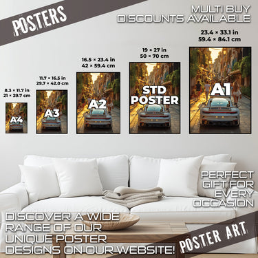 This print is perfect for adding a touch of sophistication, travel nostalgia, and automotive elegance to your living room, study, or any space that could use a dose of urban chic and golden hour charm.