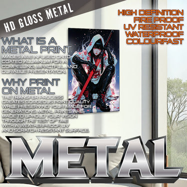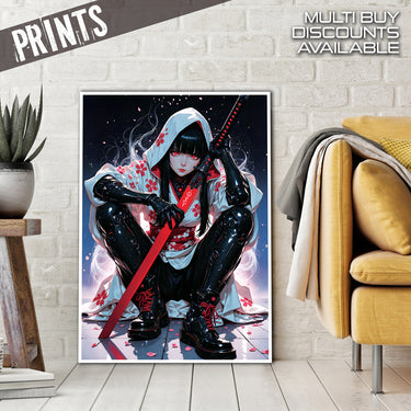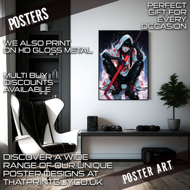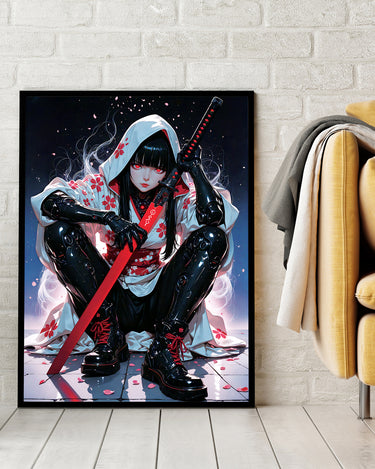 Unleash a powerful aesthetic with our "Hooded Blade" Poster Print! This striking artwork features a mysterious and captivating figure, adorned in a white hooded kimono with intricate red floral patterns, contrasted by sleek, dark, cybernetic-inspired armor on their arms and legs. With piercing red eyes and an equally vivid red katana, this character exudes strength, style, and an edgy cyberpunk appeal. Delicate pink petals seem to drift around them, adding a touch of ephemeral beauty to this bold composition.