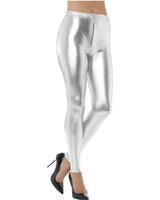 Step onto the dancefloor and relive the 1980s in these metallic silver disco leggings. With just the right amount of shine, you'll be the life of the party. Perfect for any disco diva (or divo!), these leggings will have you dancing all night long.