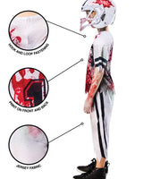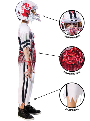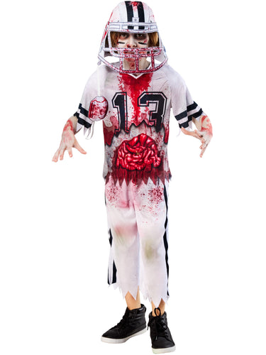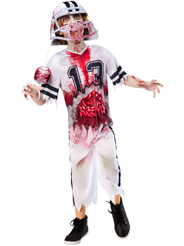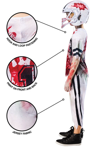 Get ready to take the field in spooky style with the Zombie American Footballer Kids Costume! Perfect for little athletes who love a creepy twist, this costume brings together gridiron grit and zombie fun. Whether it’s a 1st down or a haunted huddle, your child will score major style points while playing the part of a fierce undead footballer. Ideal for Halloween or dress-up days, this outfit combines sporty edge with spooky flair for endless fun.